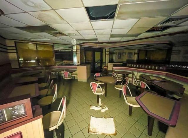 He stalks his way through the McDonald’s. There are no plates on the tables. No rubble on the floor.